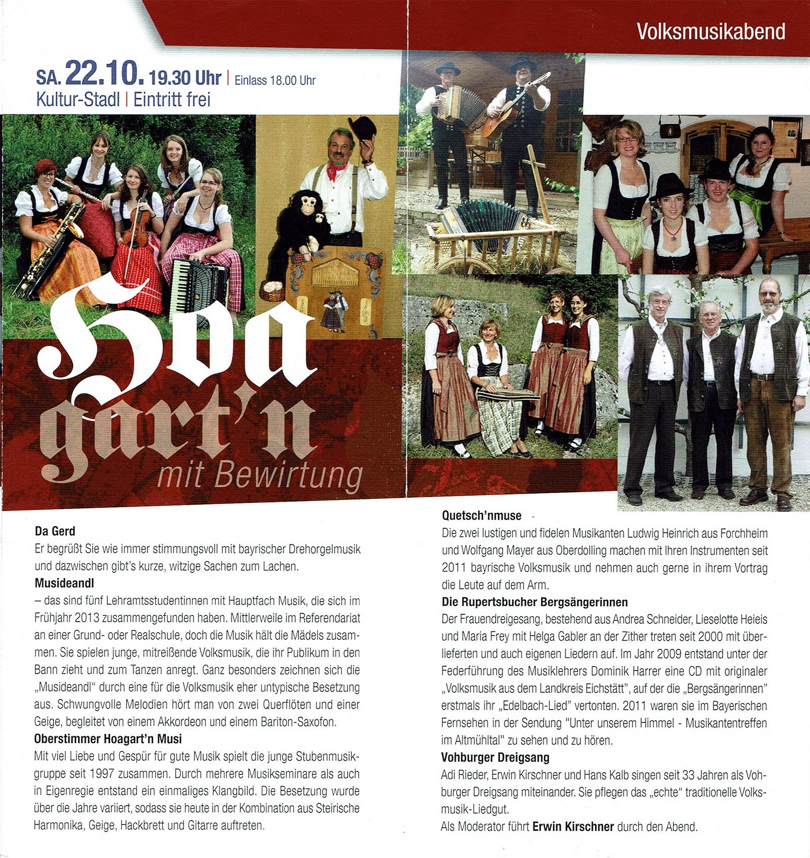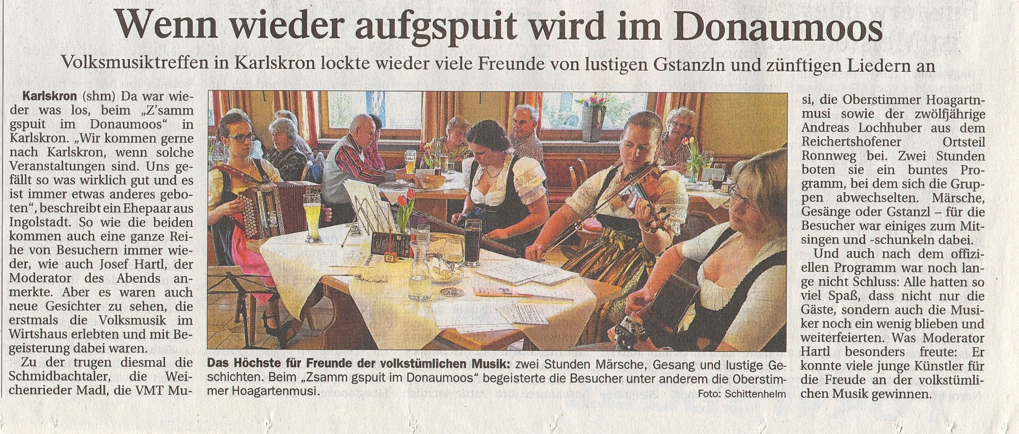 (vgl. http://www.hallertau.info/index.php?StoryID=324&newsid=101522 06.10.2017 vgl. Donaukurier)„Den Abend eröffnete die Oberstimmer Hoagartn Musi, die ihre Stücke sehr eindringlich gestaltete.“