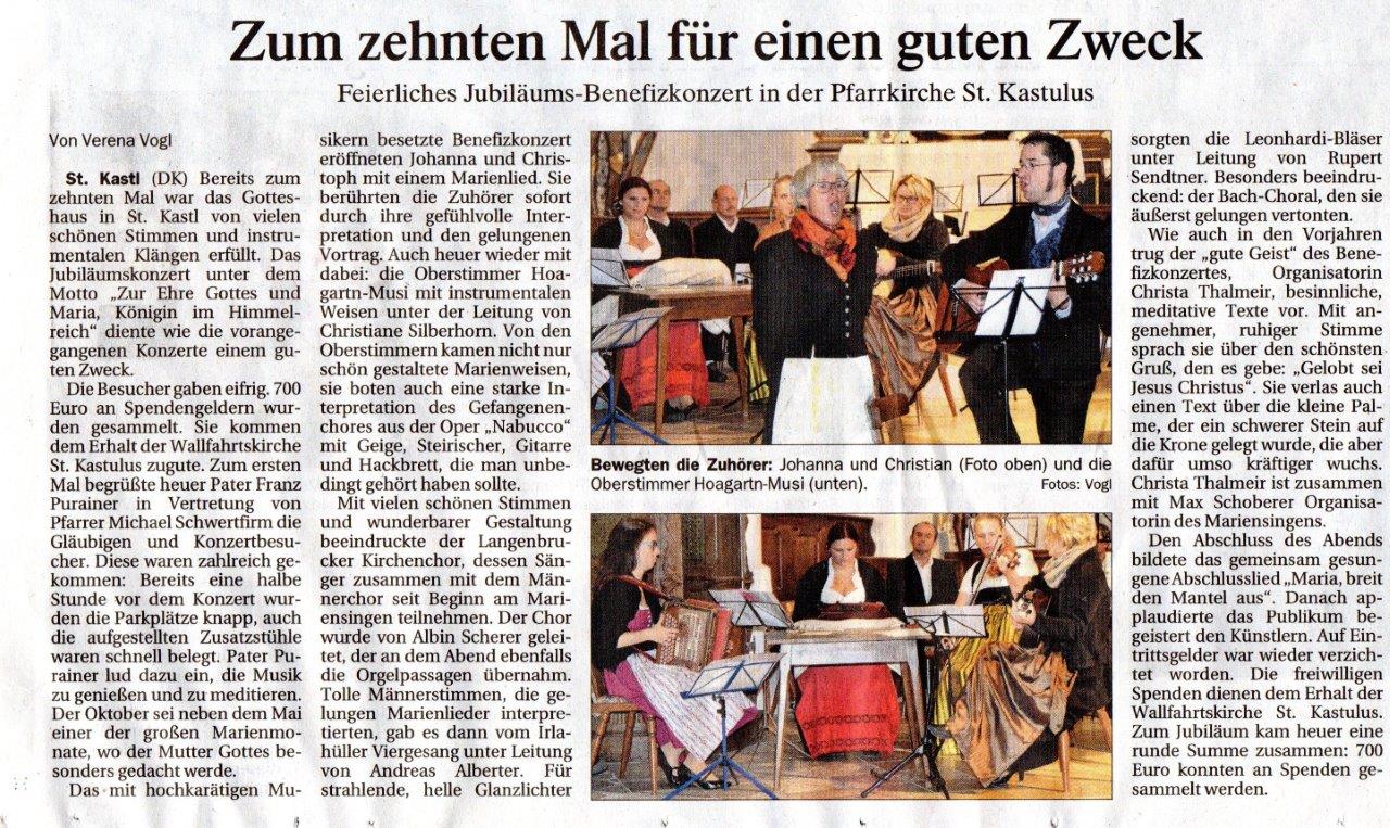 „Zum gemeinsamen Singen besinnlicher Lieder „Zur Ehre Gottes und Maria, Königin im Himmelreich“ trafen sich viele Gläubige in der Wallfahrtskirche St. Kastl. Es war die 10. Veranstaltung dieser Art in der Kirche und die Kirchenbänke waren alle voll besetzt, da diese Veranstaltung inzwischen einen hohen Zulauf hat.“