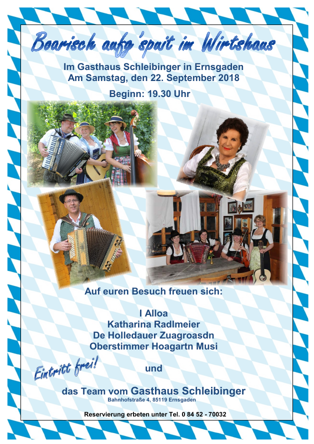 „Boarisch auf’gspuit im Wirtshaus“ am Samstag, den 22. September 2018 in Ernsgaden