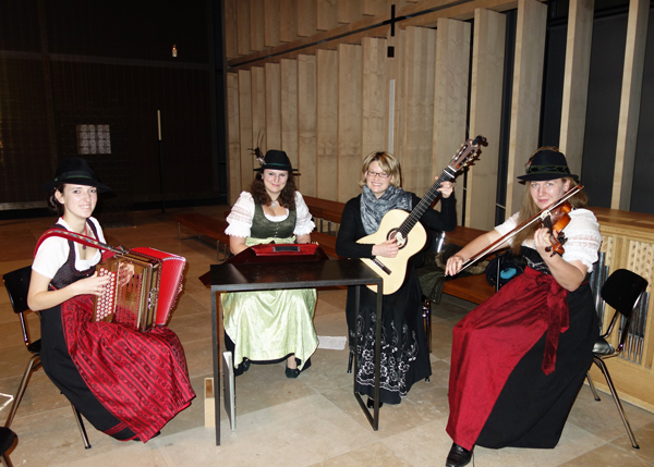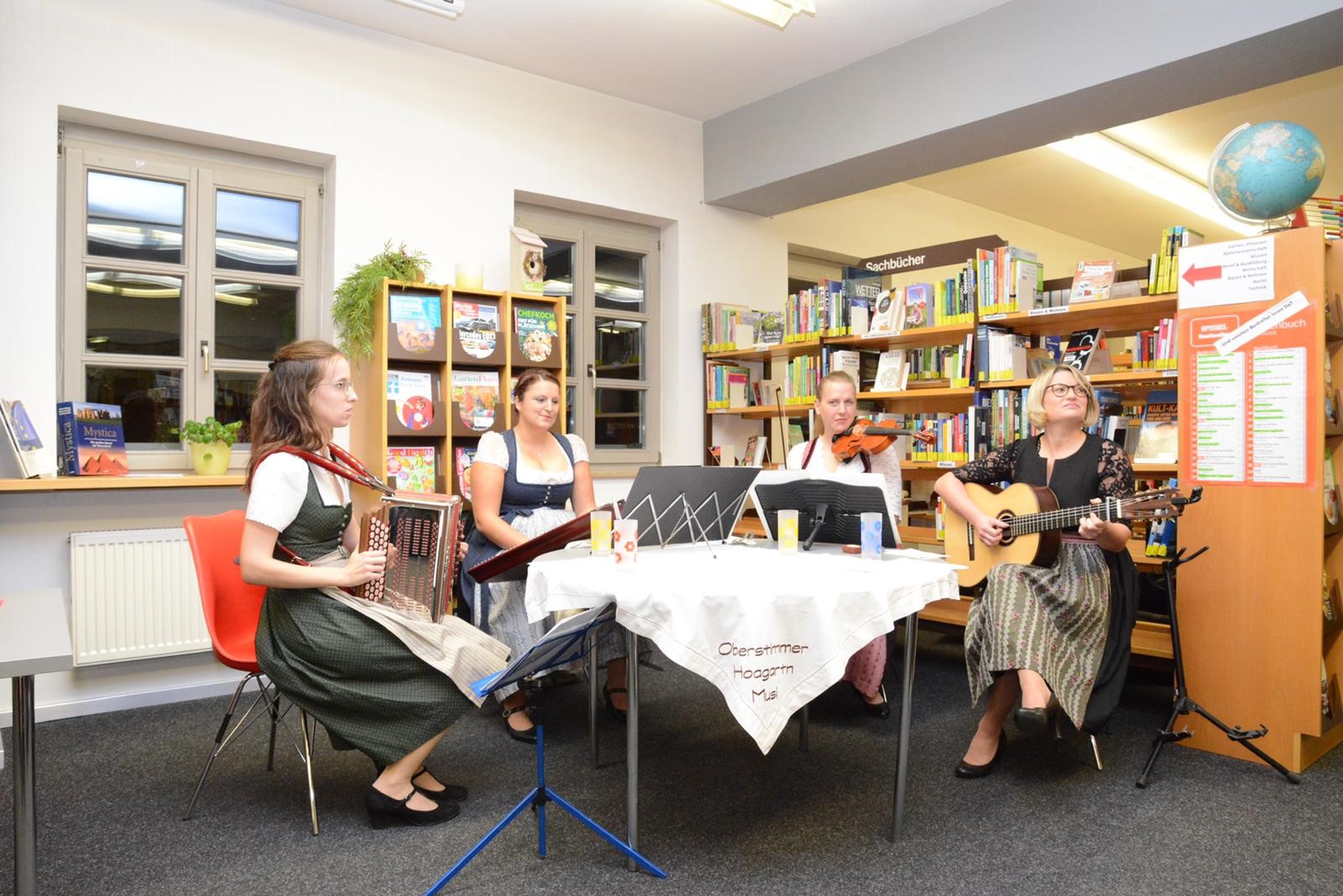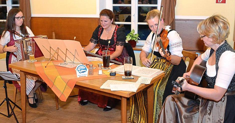 „Ruhige Weisen auf Geige, Gitarre, Ziehharmonika und Hackbrett: Die vier Musikerinnen der Oberstimmer Hoagartenmuse begeisterten den vollen Saal bei der Gaudilesung des Fördervereins Bairische Sprache und Dialekte.“