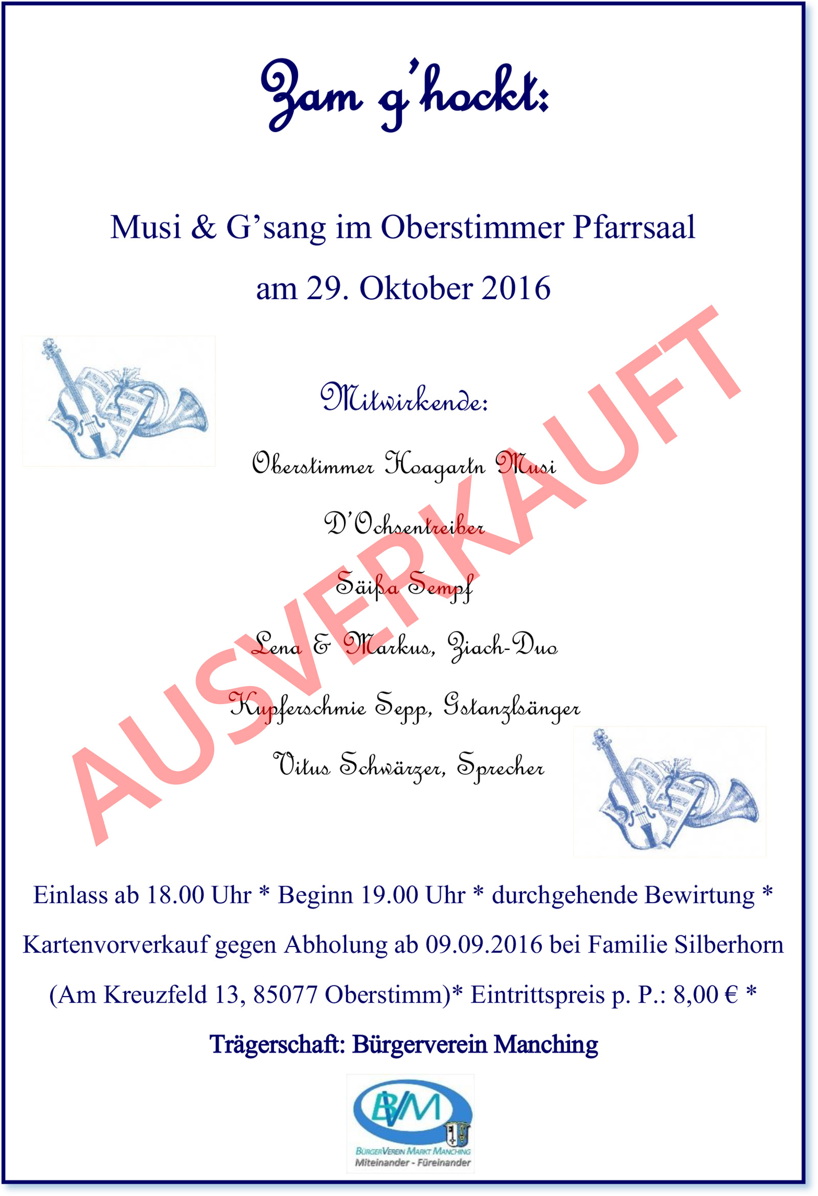 „Zam g’hockt: Musi & G’sang“ am Samstag, den 29. Oktober 2016 im Oberstimmer Pfarrsaal