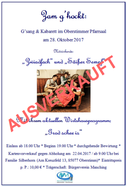 „Zam g’hockt: G’sang & Kabarett“ am Samstag, den 28. Oktober 2017 im Oberstimmer Pfarrsaal