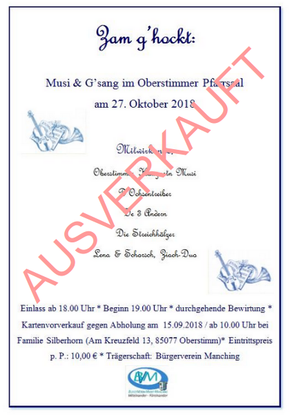 „Zam g’hockt: Musi & G’sang“ am Samstag, den 27. Oktober 2018 im Oberstimmer Pfarrsaal